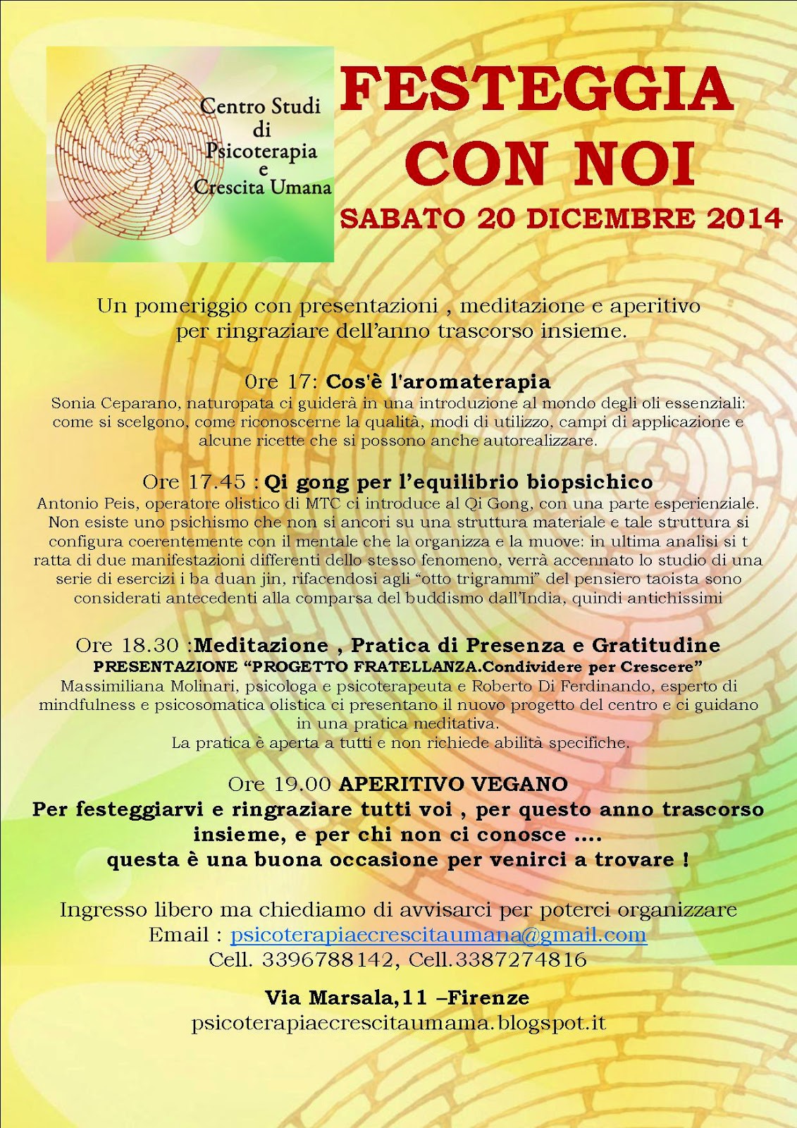 Sabato 20 dicembre pomeriggio sarà un momento per farlo, con esperti che parleranno di aromaterapia e ginnastiche della medicina tradizionale cinese, poi faremo una meditazione , presenteremo un progetto per noi prezioso, il Progetto Fratellanza, e infine brinderemo con un buffet “cruelty free”.
